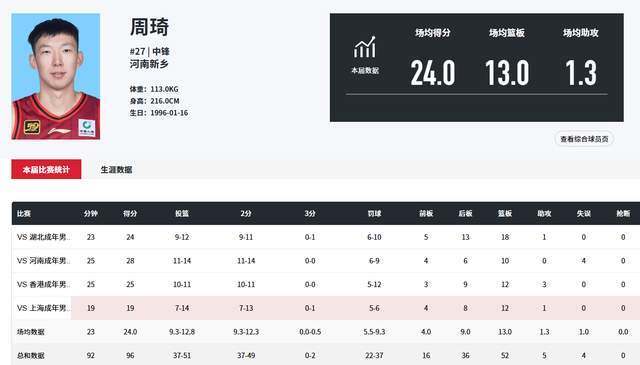 对阵湖北队,周琦打了23分钟,12投9中,10罚6中,砍下24分18篮板,率队63分大胜。对阵河南队,周琦打了25分钟,14投11中,9罚6中,砍下28分10篮板,率队24分大胜。对阵香港队,周琦打了25分钟,11投10中,12罚5中,砍下25分12篮板,率队取得33分大捷。对阵上海队,周琦只打了19分钟,但依旧十分高效,14投7中,6罚5中,拿下19分12篮板。