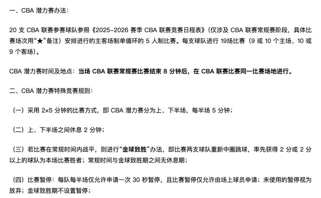 根据官方文件披露,CBA潜力赛采用2×5分钟的比赛方式,上下半场各5分钟,中间休息2分钟。若常规时间战平,比赛将进入激动人心的 “金球致胜”环节——双方重新中圈跳球,率先获得2分或2分以上的球队获胜