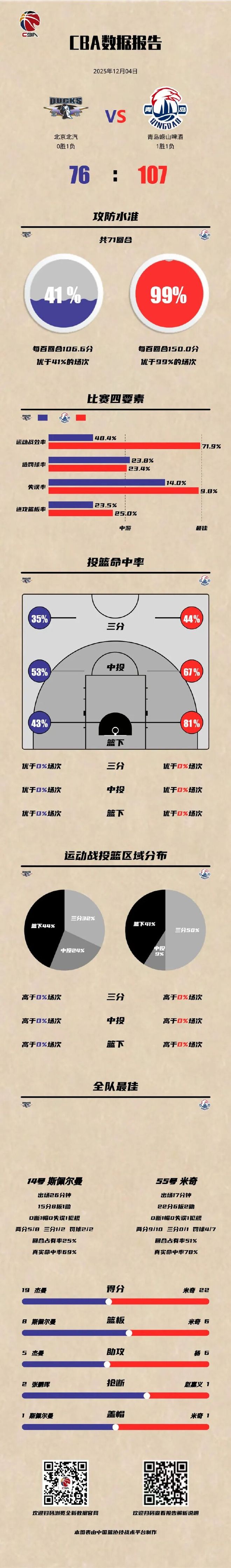 北京时间2025年12月4日,第二届中国人寿·CBA俱乐部杯小组赛第二个比赛日,青岛崂山啤酒对阵北京北汽。五人得分上双,四外援合力拿下66分,赢下这场胜利。比赛开局,米奇连续得分,约瑟夫杨、汤普森逐步找到手感,56-49领先对手进入下半场。易边再战,青岛崂山啤酒打出一波11-0进攻潮,并将领先优势保持到最后,最终107-76大胜对手。