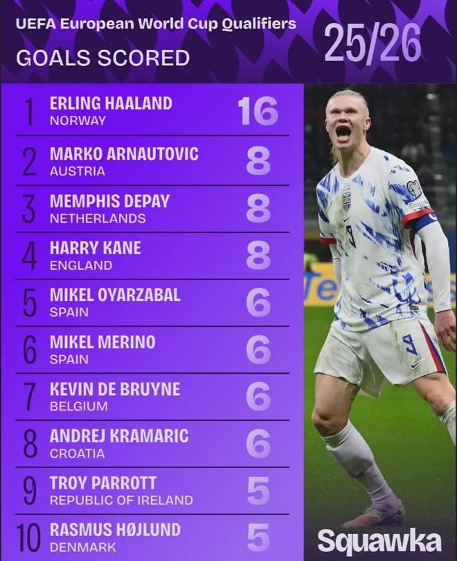 Squawka统计了世界杯欧洲区预选赛阶段助攻最多的球员数据,厄德高7次助攻领跑!赖斯4次助攻并列第三!