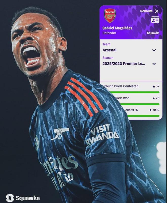 Squawka统计,加布里埃尔是本赛季英超出战500分钟以上的后卫中,地面对抗成功率最高的:32次对抗,25次成功,成功率78.12%。
