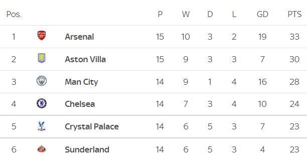 最终,曼城以3比0的比分战胜桑德兰。在英超积分榜上,阿森纳以33分排名榜首,曼城、维拉分别以31分、30分排名第2、3位。