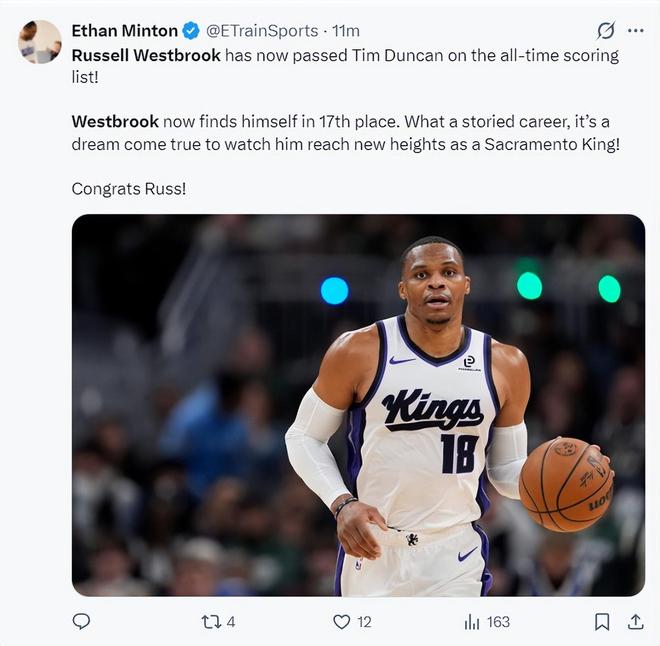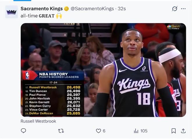 国王记者为威少喝彩,国王官方也晒出了海报祝贺威少,上半场威少17分钟,7中3,三分4中2,拿到8分2篮板5助攻,火箭的策略还是放他投篮,但威少把握住了两个外线三分空位。