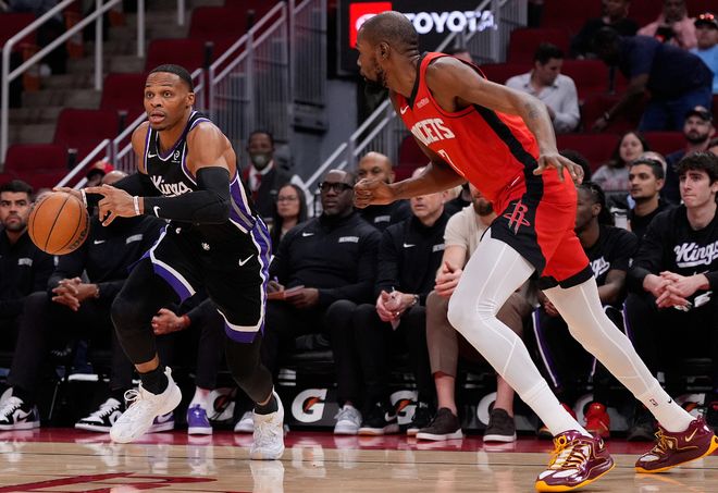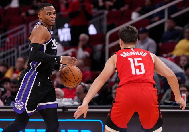北京时间12月4日,NBA常规赛,国王惨败火箭吞下4连败。这场比赛又是拉塞尔-威斯布鲁克的里程碑夜晚,他的生涯总得分超过邓肯26496分升至NBA历史得分榜的第17位。这场比赛威少打了28分钟拿到12分9助攻4篮板1抢断4失误,拿着363万底薪的他真的尽力了,拉文5中1就2分。